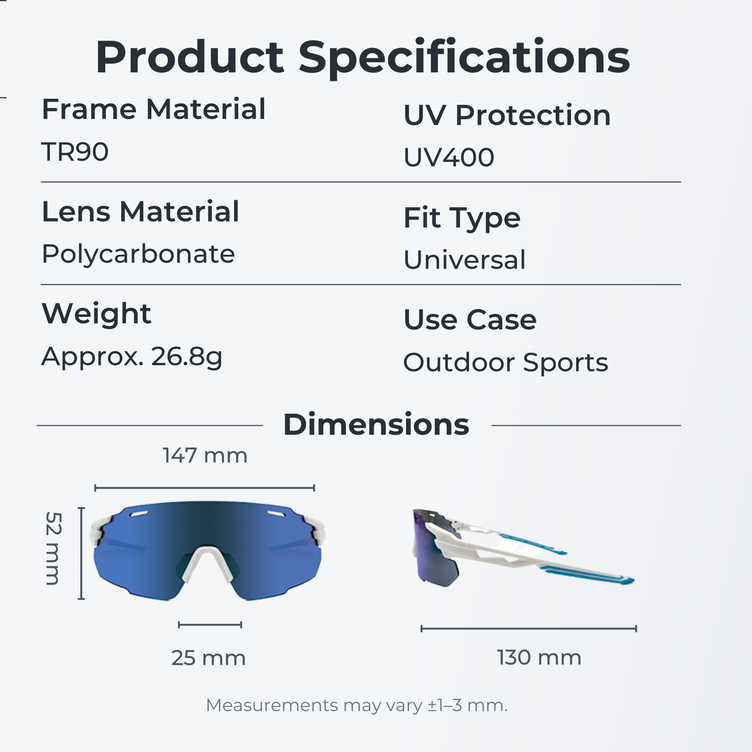 Lightweight, flexible, and built for speed — these TR90 sport sunglasses deliver a wide, unobstructed field of view and secure, pressure-free comfort for every outdoor workout. Featuring a shatter-resistant PC lens with UV400 protection, non-slip rubber temples, and an adjustable soft nosepad, they stay firmly in place through cycling, running, and high-intensity training. At just 26.8g, they feel weightless while providing vivid clarity and dependable wind resistance.